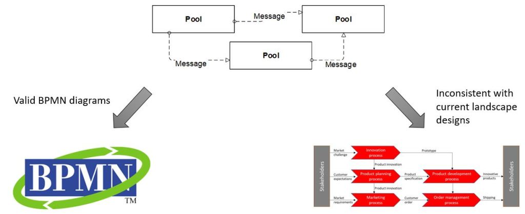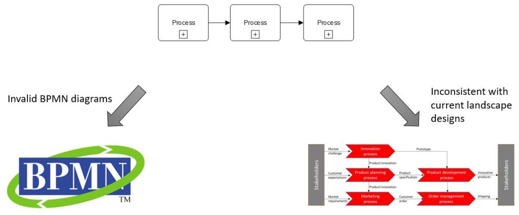 A review of the presented BPMN approaches for modeling of process landscapes reveals that all three approaches lack either of concepts, which are present in a landscapes modeling domain or there lack of visual compatibility with landscape diagrams used in practice (e.g. value chains). Besides, the third approach is non-compliant with the standard and so not advisable.