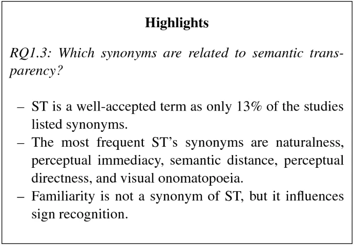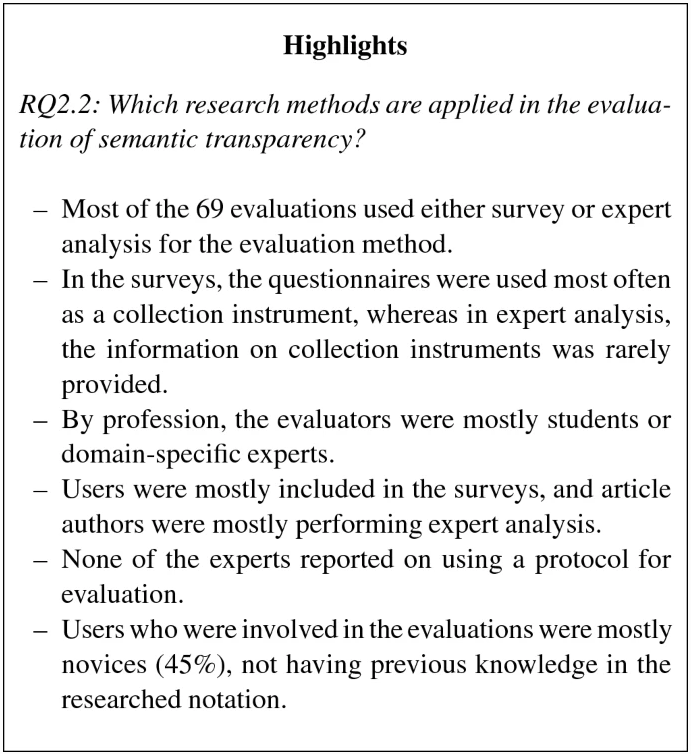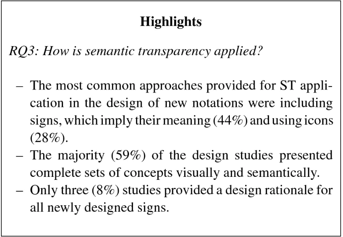 To meet these objectives, we performed a systematic literature review with 94 studies passing the selection process criteria. The results reject one of the three aspects, which define semantic transparency (ST), namely “ST is achieved with the use of icons.” Besides, taxonomies of related concepts and research methods, evaluation metrics, and other findings from this study can help to conduct verifiable ST-related experiments and applications, consequently improving the visual vocabularies of notations and effectiveness of the resulting diagrams.