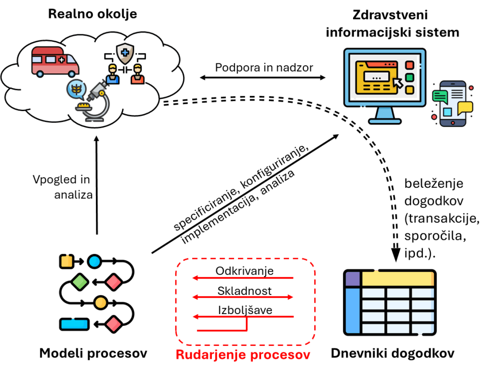 Rudarjenje procesov je sinonim za množico tehnik in tehnologij, ki omogočajo avtomatsko odkrivanje znanja o procesih neposredno, na osnovi podatkov, ki so pridobljeni iz informacijskega sistema podjetja. V prispevku so predstavljene osnove rudarjenja procesov, pomen dnevnikov dogodkov in naprednih algoritmov za odkrivanje, preverjanje skladnosti in izboljšave procesov. Osrednji del prispevka je demonstracija zmožnosti sodobnih orodij za rudarjenje procesov, ki temeljijo na dnevniku dogodkov, pridobljenem iz zdravstvenega informacijskega sistema in so sledeče: avtomatizirano odkrivanje procesov, rudarjenje uspešnosti procesov, preverjanje skladnosti in analiza različic izvajanih procesov.
